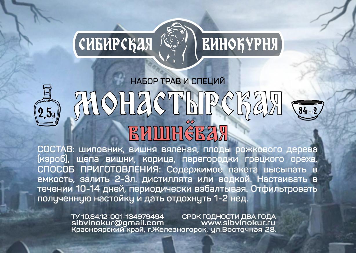 96г Для приготовления 2,5 литров крепкого напитка. Состав: шиповник, вишня вяленая, плоды рожкового дерева (кэроб), щепа вишни, корица, перегородки грецкого ореха. Способ приготовления: Содержимое пакета высыпать в емкость, залить 2-3л. Дистиллята или водкой. Настаивать в течении 10-14 дней, периодически взбалтывая. Отфильтровать полученную настойку и дать отдохнуть 1-2 недели. Описание: Изучая старые русские издания о наливках, настойках, мы наткнулись на интересный рецепт настойки «Монастырской». Авторы издания ссылались на первое упоминание этого напитка в 18 веке. Делали и употребляли его монахи в монастырях Испании. В рецепте было упоминание о интересном ингредиенте «Царьградский рожок». Сейчас мы эту специю называем «Кэроб». Он придает настойке вкус какао, шоколада. Настойка получается сладкая, мягкая на вкус и в начале чётко выражен аромат вишни с другой стороны кэроб придает ей достаточно интересные нотки шоколада, а присутствие корицы создает долгое пряное послевкусие. Настойка хорошо сочетается с мясом птицы: курицей, индейкой, уткой, с сыром, фруктами, десертами. При уменьшении объема до полутора литров и увеличении времени настаивания до трёх недель, получается наливка с насыщенным вкусом, которая хорошо разбавляется вишневым, (яблочным) соком, тоником с добавлением льда. Настойка очень оригинальная и её рецепт впервые доработан и применен нами. У других производителей вы ее не найдете. Релиз: мягкая приятная настойка с послевкусием корицы и шоколада
